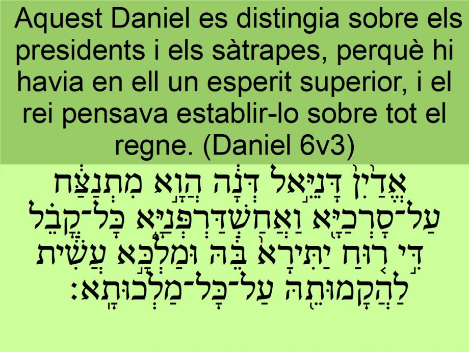 Daniel 6v3 Aquest Daniel es distingia sobre els presidents i els sàtrapes, perquè hi havia en ell un esperit superior, i el rei pensava establir-lo sobre tot el regne.אֱדַ֙יִן֙ דָּנִיֵּ֣אל דְּנָ֔ה הֲוָ֣א מִתְנַצַּ֔ח עַל־סָרְכַיָּ֖א וַאֲחַשְׁדַּרְפְּנַיָּ֑א כָּל־קֳבֵ֗ל דִּ֣י ר֤וּחַ יַתִּירָא֙ בֵּ֔הּ וּמַלְכָּ֣א עֲשִׁ֔ית לַהֲקָמוּתֵ֖הּ עַל־כָּל־מַלְכוּתָֽא׃ Then <0116> this <01836> Daniel <01841> was <01934> (08754) preferred <05330> (08723) above <05922> the presidents <05632> and princes <0324>, because <03606> <06903> an excellent <03493> spirit <07308> was in him; and the king <04430> thought <06246> (08754) to set <06966> (08682) him over <05922> the whole <03606> realm <04437>.