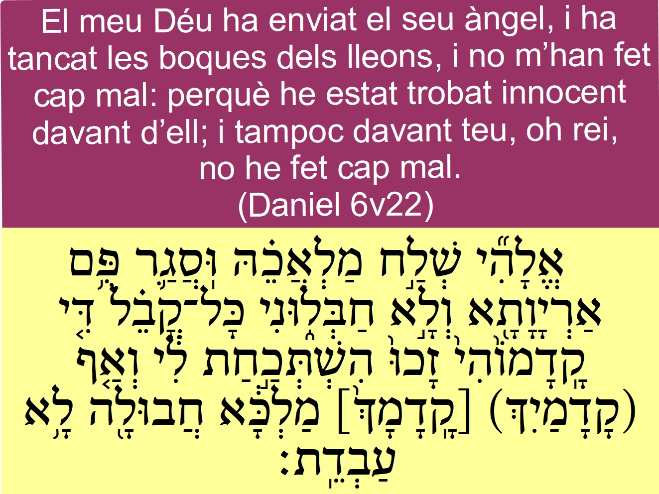 Daniel 6v22 El meu Déu ha enviat el seu àngel, i ha tancat les boques dels lleons, i no m’han fet cap mal: perquè he estat trobat innocent davant d’ell; i tampoc davant teu, oh rei, no he fet cap mal.  אֱלָהִ֞י שְׁלַ֣ח מַלְאֲכֵ֗הּ וּֽסֲגַ֛ר פֻּ֥ם אַרְיָו