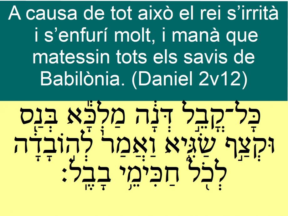 Daniel 2v12 A causa de tot això el rei s’irrità i s’enfurí molt, i manà que matessin tots els savis de Babilònia. כָּל־קֳבֵ֣ל דְּנָ֔ה מַלְכָּ֕א בְּנַ֖ס וּקְצַ֣ף שַׂגִּ֑יא וַאֲמַר֙ לְה֣וֹבָדָ֔ה לְכֹ֖ל חַכִּימֵ֥י בָבֶֽל׃ For <06903> this <01836> cause <03606> the king <04430> was angry <01149> (08754) and very <07690> furious <07108> (08754), and commanded <0560> (08754) to destroy <07> (08682) all <03606> the wise <02445> men of Babylon <0895>.