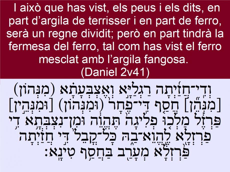 Daniel 2v41 I això que has vist, els peus i els dits, en part d’argila de terrisser i en part de ferro, serà un regne dividit; però en part tindrà la fermesa del ferro, tal com has vist el ferro mesclat amb l’argila fangosa.וְדִֽי־חֲזַ֜יְתָה רַגְלַיָּ֣א וְאֶצְבְּעָתָ֗א (מִנְּהוֹן) [מִנְּהֵ֞ן] חֲסַ֤ף דִּֽי־פֶחָר֙ (וּמִנְּהוֹן) [וּמִנְּהֵ֣ין] פַּרְזֶ֔ל מַלְכ֤וּ פְלִיגָה֙ תֶּהֱוֵ֔ה וּמִן־נִצְבְּתָ֥א דִ֥י פַרְזְלָ֖א לֶֽהֱוֵא־בַ֑הּ כָּל־קֳבֵל֙ דִּ֣י חֲזַ֔יְתָה פַּ֙רְזְלָ֔א מְעָרַ֖ב בַּחֲסַ֥ף טִינָֽא׃ And whereas thou sawest <02370> (08754) the feet <07271> and toes <0677>, part <04481> of potters' <06353> clay <02635>, and part <04481> of iron <06523>, the kingdom <04437> shall be <01934> (08748) divided <06386> (08752); but <04481> <00> there shall be <01934> (08748) in it of <04481> the strength <05326> of the iron <06523>, forasmuch as <03606> <06903> thou sawest <02370> (08754) the iron <06523> mixed <06151> (08743) with miry <02917> clay <02635>.