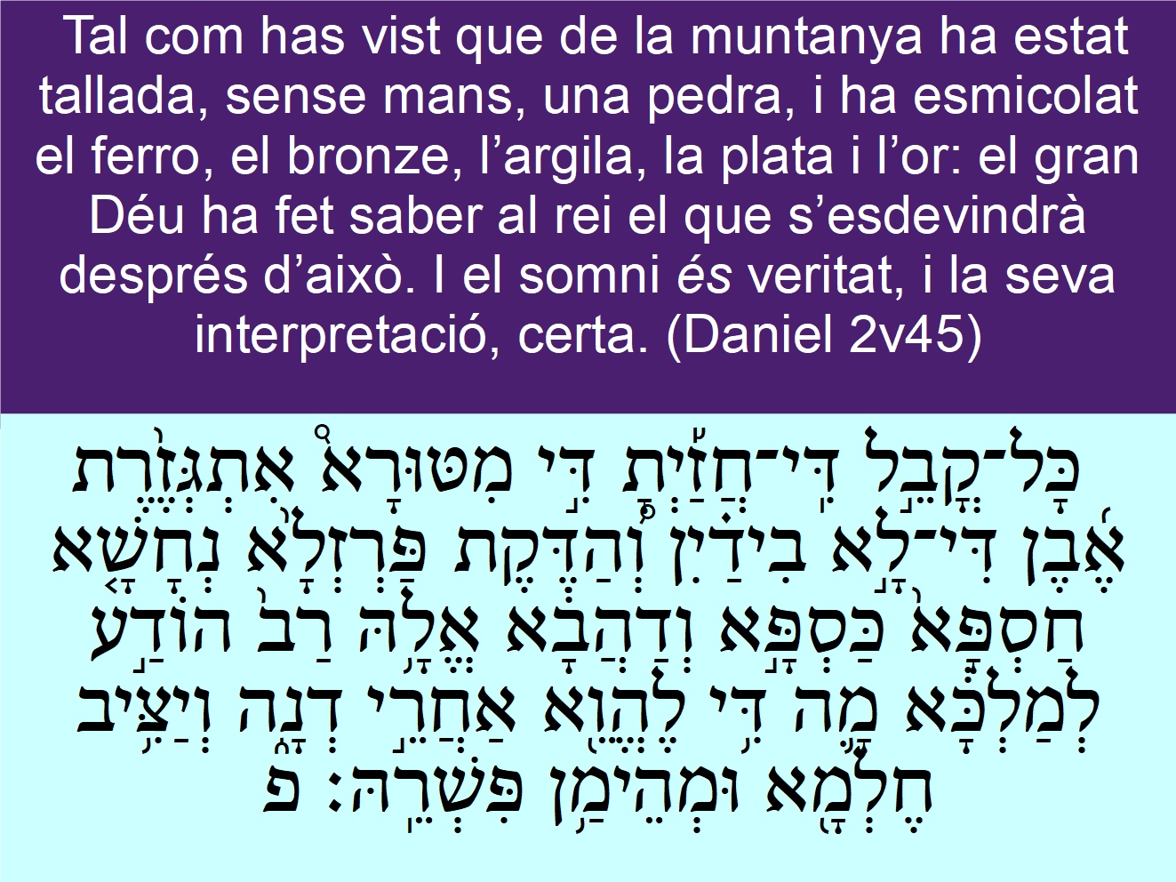 Daniel 2v45 Tal com has vist que de la muntanya ha estat tallada, sense mans, una pedra, i ha esmicolat el ferro, el bronze, l’argila, la plata i l’or: el gran Déu ha fet saber al rei el que s’esdevindrà després d’això. I el somni és veritat, i la seva interpretació, certa.כָּל־קֳבֵ֣ל דִּֽי־חֲזַ֡יְתָ דִּ֣י מִטּוּרָא֩ אִתְגְּזֶ֙רֶת אֶ֜בֶן דִּי־לָ֣א בִידַ֗יִן וְ֠הַדֶּקֶת פַּרְזְלָ֙א נְחָשָׁ֤א חַסְפָּא֙ כַּסְפָּ֣א וְדַהֲבָ֔א אֱלָ֥הּ רַב֙ הוֹדַ֣ע לְמַלְכָּ֔א מָ֛ה דִּ֥י לֶהֱוֵ֖א אַחֲרֵ֣י דְנָ֑ה וְיַצִּ֥יב חֶלְמָ֖א וּמְהֵימַ֥ן פִּשְׁרֵֽהּ׃ פ Forasmuch as <03606> <06903> thou sawest <02370> (08754) that the stone <069> was cut out <01505> (08728) of the mountain <02906> without <03809> hands <03028>, and that it brake in pieces <01855> (08684) the iron <06523>, the brass <05174>, the clay <02635>, the silver <03702>, and the gold <01722>; the great <07229> God <0426> hath made known <03046> (08684) to the king <04430> what <04101> shall come to pass <01934> (08748) hereafter <0311> <01836>: and the dream <02493> is certain <03330>, and the interpretation <06591> thereof sure <0540> (08683).