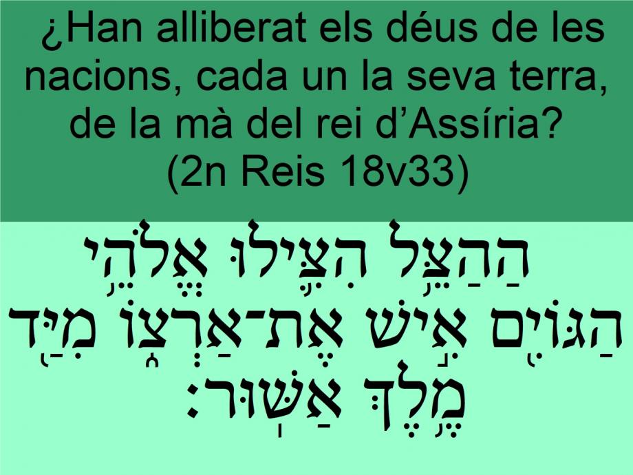 2n Reis 18v33 ¿Han alliberat els déus de les nacions, cada un la seva terra, de la mà del rei d’Assíria? הַהַצֵּ֥ל הִצִּ֛ילוּ אֱלֹהֵ֥י הַגּוֹיִ֖ם אִ֣ישׁ אֶת־אַרְצ֑וֹ מִיַּ֖ד מֶ֥לֶךְ אַשּֽׁוּר׃ Hath any <0376> of the gods <0430> of the nations <01471> delivered <05337> (08689) at all <05337> (08687) his land <0776> out of the hand <03027> of the king <04428> of Assyria <0804>?