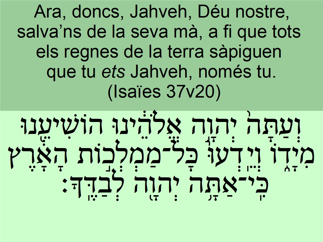 Isaïes 37v20 Ara, doncs, Jahveh, Déu nostre, salva’ns de la seva mà, a fi que tots els regnes de la terra sàpiguen que tu ets Jahveh, només tu. וְעַתָּה֙ יְהוָ֣ה אֱלֹהֵ֔ינוּ הוֹשִׁיעֵ֖נוּ מִיָד֑וֹ וְיֵֽדְעוּ֙ כָּל־מַמְלְכ֣וֹת הָאָ֔רֶץ כִּֽי־אַתָּ֥ה יְהוָ֖ה לְבַדֶּֽךָ׃ Now therefore, O LORD <03068> our God <0430>, save <03467> (08685) us from his hand <03027>, that all the kingdoms <04467> of the earth <0776> may know <03045> (08799) that thou art the LORD <03068>, even thou only.