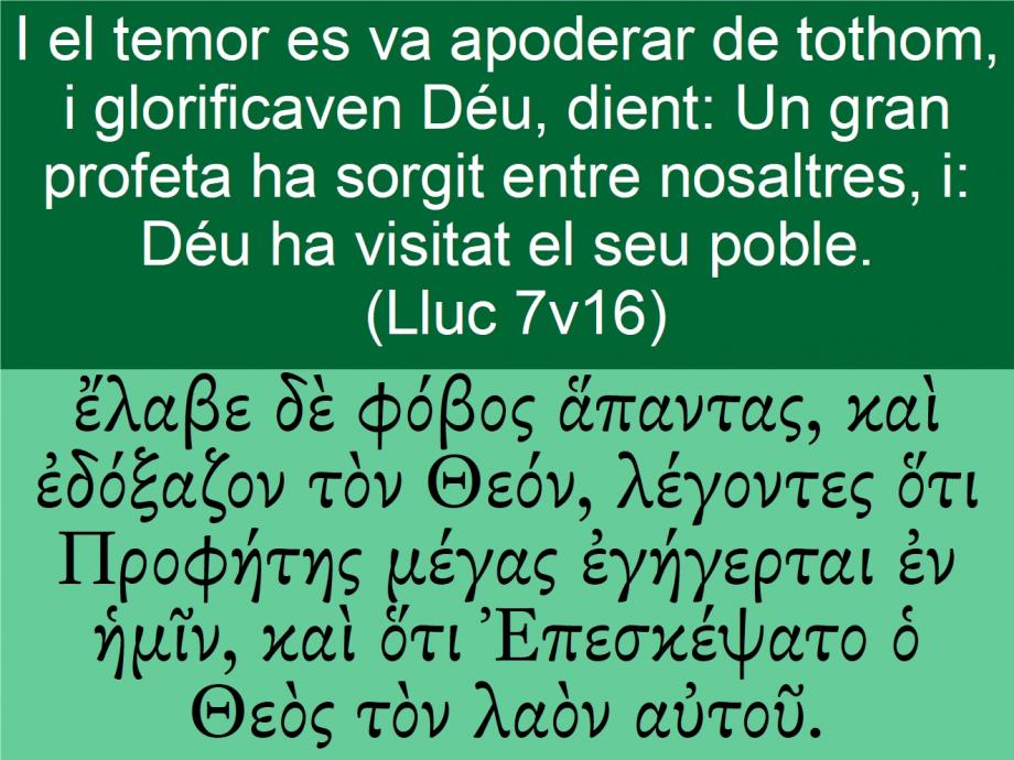 Lluc 7v16 I el temor es va apoderar de tothom, i glorificaven Déu, dient: Un gran profeta ha sorgit entre nosaltres, i: Déu ha visitat el seu poble.ἔλαβε δὲ φόβος ἅπαντας, καὶ ἐδόξαζον τὸν Θεόν, λέγοντες ὅτι Προφήτης μέγας ἐγήγερται ἐν ἡμῖν, καὶ ὅτι Ἐπεσκέψατο ὁ Θεὸς τὸν λαὸν αὐτοῦ.And <1161> there came <2983> (5627) a fear <5401> on all <537>: and <2532> they glorified <1392> (5707) God <2316>, saying <3004> (5723), That <3754> a great <3173> prophet <4396> is risen up <1453> (5769) among <1722> us <2254>; and <2532>, That <3754> God <2316> hath visited <1980> (5662) his <846> people <2992>.