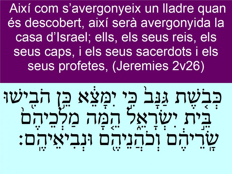 Jeremies 2v26 Així com s’avergonyeix un lladre quan és descobert, així serà avergonyida la casa d’Israel; ells, els seus reis, els seus caps, i els seus sacerdots i els seus profetes, כְּבֹ֤שֶׁת גַּנָּב֙ כִּ֣י יִמָּצֵ֔א כֵּ֥ן הֹבִ֖ישׁוּ בֵּ֣ית יִשְׂרָאֵ֑ל הֵ֤מָּה מַלְכֵיהֶם֙ שָֽׂרֵיהֶ֔ם וְכֹהֲנֵיהֶ֖ם וּנְבִיאֵיהֶֽם׃ As the thief <01590> is ashamed <01322> when he is found <04672> (08735), so is the house <01004> of Israel <03478> ashamed <03001> (08689); they, their kings <04428>, their princes <08269>, and their priests <03548>, and their prophets <05030>,