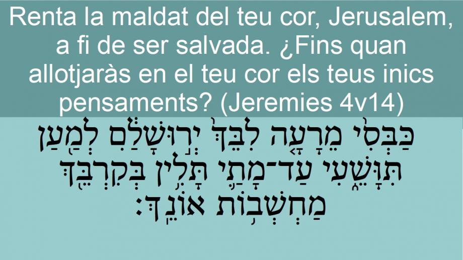 Jeremies 4v14 Renta la maldat del teu cor, Jerusalem, a fi de ser salvada. ¿Fins quan allotjaràs en el teu cor els teus inics pensaments?כַּבְּסִ֙י מֵרָעָ֤ה לִבֵּךְ֙ יְר֣וּשָׁלִַ֔ם לְמַ֖עַן תִּוָּשֵׁ֑עִי עַד־מָתַ֛י תָּלִ֥ין בְּקִרְבֵּ֖ךְ מַחְשְׁב֥וֹת אוֹנֵֽךְ׃ O Jerusalem <03389>, wash <03526> (08761) thine heart <03820> from wickedness <07451>, that thou mayest be saved <03467> (08735). How long shall thy vain <0205> thoughts <04284> lodge <03885> (08686) within <07130> thee?