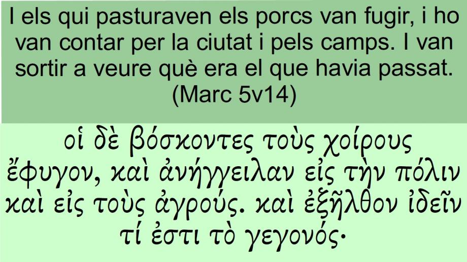 Marc 5v14 I els qui pasturaven els porcs van fugir, i ho van contar per la ciutat i pels camps. I van sortir a veure què era el que havia passat.οἱ δὲ βόσκοντες τοὺς χοίρους ἔφυγον, καὶ ἀνήγγειλαν εἰς τὴν πόλιν καὶ εἰς τοὺς ἀγρούς. καὶ ἐξῆλθον ἰδεῖν τί ἐστι τὸ γεγονός·And <1161> they that fed <1006> (5723) the swine <5519> fled <5343> (5627), and <2532> told <312> (5656) it in <1519> the city <4172>, and <2532> in <1519> the country <68>. And <2532> they went out <1831> (5627) to see <1492> (5629) what <5101> it was <2076> (5748) that was done <1096> (5756).