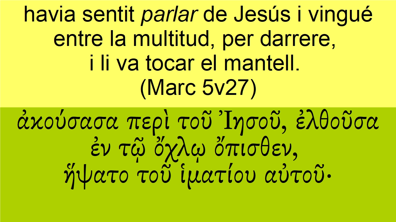 Marc 5v27 havia sentit parlar de Jesús i vingué entre la multitud, per darrere, i li va tocar el mantell.ἀκούσασα περὶ τοῦ Ἰησοῦ, ἐλθοῦσα ἐν τῷ ὄχλῳ ὄπισθεν, ἥψατο τοῦ ἱματίου αὐτοῦ·When she had heard <191> (5660) of <4012> Jesus <2424>, came <2064> (5631) in <1722> the press <3793> behind <3693>, and touched <680> (5662) his <846> garment <2440>.