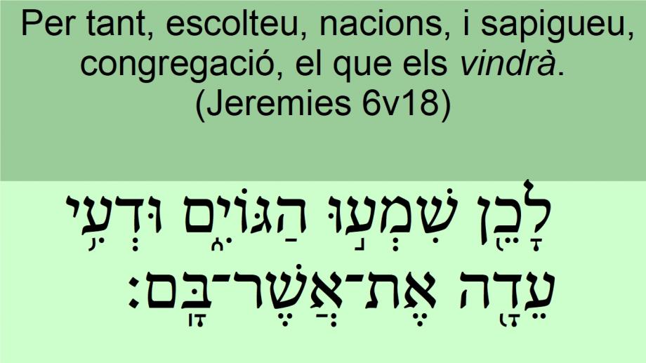 Jeremies 6v18 Per tant, escolteu, nacions, i sapigueu, congregació, el que els vindrà. לָכֵ֖ן שִׁמְע֣וּ הַגּוֹיִ֑ם וּדְעִ֥י עֵדָ֖ה אֶת־אֲשֶׁר־בָּֽם׃ Therefore hear <08085> (08798), ye nations <01471>, and know <03045> (08798), O congregation <05712>, what is among them