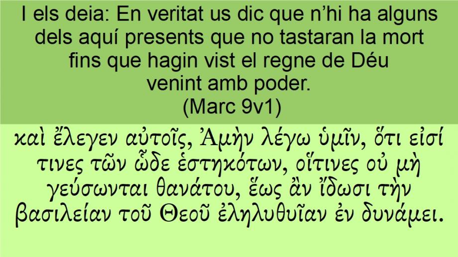 Marc 9v1 I els deia: En veritat us dic que n’hi ha alguns dels aquí presents que no tastaran la mort fins que hagin vist el regne de Déu venint amb poder.καὶ ἔλεγεν αὐτοῖς, Ἀμὴν λέγω ὑμῖν, ὅτι εἰσί τινες τῶν ὧδε ἑστηκότων, οἵτινες οὐ μὴ γεύσωνται θανάτου, ἕως ἂν ἴδωσι τὴν βασιλείαν τοῦ Θεοῦ ἐληλυθυῖαν ἐν δυνάμει.And <2532> he said <3004> (5707) unto them <846>, Verily <281> I say <3004> (5719) unto you <5213>, That <3754> there be <1526> (5748) some <5100> of them that stand <2476> (5761) here <5602>, which <3748> shall <1089> <0> not <3364> taste <1089> (5667) of death <2288>, till <2193> <302> they have seen <1492> (5632) the kingdom <932> of God <2316> come <2064> (5756) with <1722> power <1411>.