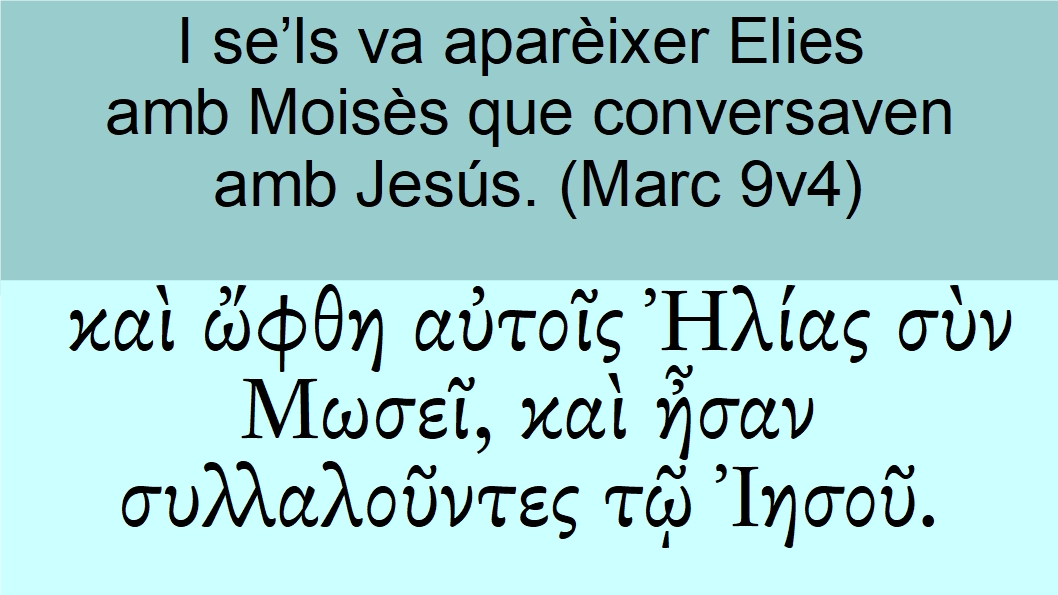 Marc 9v4 I se’ls va aparèixer Elies amb Moisès que conversaven amb Jesús.καὶ ὤφθη αὐτοῖς Ἠλίας σὺν Μωσεῖ, καὶ ἦσαν συλλαλοῦντες τῷ Ἰησοῦ.And <2532> there appeared <3700> (5681) unto them <846> Elias <2243> with <4862> Moses <3475>: and <2532> they were <2258> (5713) talking <4814> (5723) with Jesus <2424>.