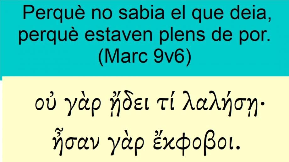 Marc 9v6 Perquè no sabia el que deia, perquè estaven plens de por.οὐ γὰρ ᾔδει τί λαλήσῃ· ἦσαν γὰρ ἔκφοβοι.For <1063> he wist <1492> (5715) not <3756> what <5101> to say <2980> (5661); for <1063> they were sore <2258> (5713) afraid <1630>.