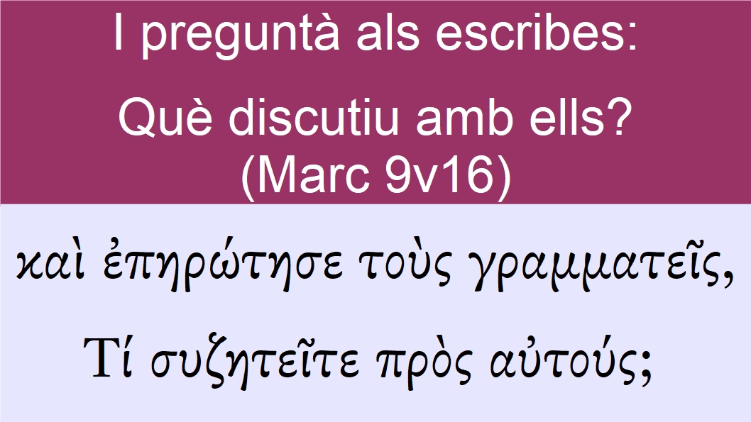 Marc 9v16 I preguntà als escribes: Què discutiu amb ells?καὶ ἐπηρώτησε τοὺς γραμματεῖς, Τί συζητεῖτε πρὸς αὐτούς;And <2532> he asked <1905> (5656) the scribes <1122>, What <5101> question ye <4802> (5719) with <4314> them <846>?