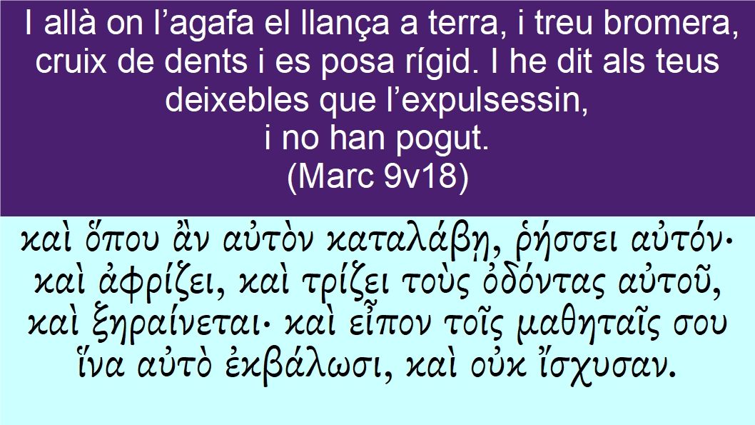 Marc 9v18 I allà on l’agafa el llança a terra, i treu bromera, cruix de dents i es posa rígid. I he dit als teus deixebles que l’expulsessin, i no han pogut.καὶ ὅπου ἂν αὐτὸν καταλάβῃ, ῥήσσει αὐτόν· καὶ ἀφρίζει, καὶ τρίζει τοὺς ὀδόντας αὐτοῦ, καὶ ξηραίνεται· καὶ εἶπον τοῖς μαθηταῖς σου ἵνα αὐτὸ ἐκβάλωσι, καὶ οὐκ ἴσχυσαν.And <2532> wheresoever <3699> <302> he taketh <2638> (5632) him <846>, he teareth <4486> (5719) him <846>: and <2532> he foameth <875> (5719), and <2532> gnasheth <5149> (5719) with his <846> teeth <3599>, and <2532> pineth away <3583> (5743): and <2532> I spake <2036> (5627) to thy <4675> disciples <3101> that <2443> they should cast <1544> <0> him <846> out <1544> (5632); and <2532> they could <2480> (5656) not <3756>.