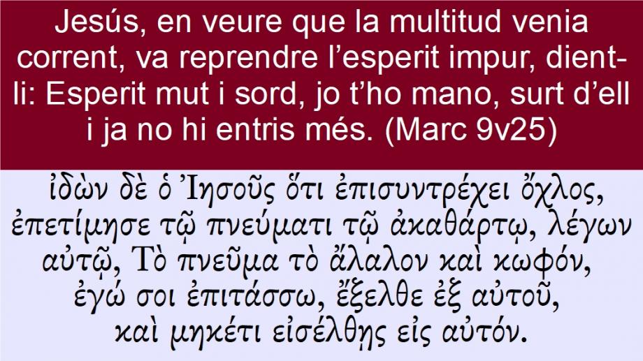 Marc 9v25 Jesús, en veure que la multitud venia corrent, va reprendre l’esperit impur, dient-li: Esperit mut i sord, jo t’ho mano, surt d’ell i ja no hi entris més.ἰδὼν δὲ ὁ Ἰησοῦς ὅτι ἐπισυντρέχει ὄχλος, ἐπετίμησε τῷ πνεύματι τῷ ἀκαθάρτῳ, λέγων αὐτῷ, Τὸ πνεῦμα τὸ ἄλαλον καὶ κωφόν, ἐγώ σοι ἐπιτάσσω, ἔξελθε ἐξ αὐτοῦ, καὶ μηκέτι εἰσέλθῃς εἰς αὐτόν.When <1161> Jesus <2424> saw <1492> (5631) that <3754> the people <3793> came running together <1998> (5719), he rebuked <2008> (5656) the foul <169> spirit <4151>, saying <3004> (5723) unto him <846>, Thou dumb <216> and <2532> deaf <2974> spirit <4151>, I <1473> charge <2004> (5719) thee <4671>, come <1831> (5628) out of <1537> him <846>, and <2532> enter <1525> (5632) no more <3371> into <1519> him <846>.