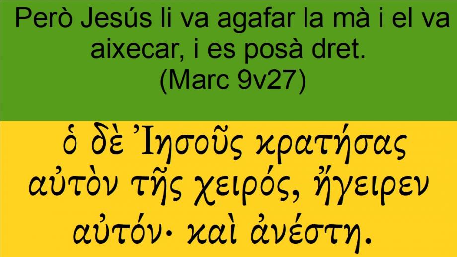 Marc 9v27 Però Jesús li va agafar la mà i el va aixecar, i es posà dret.ὁ δὲ Ἰησοῦς κρατήσας αὐτὸν τῆς χειρός, ἤγειρεν αὐτόν· καὶ ἀνέστη.But <1161> Jesus <2424> took <2902> (5660) him <846> by the hand <5495>, and lifted <1453> <0> him <846> up <1453> (5656); and <2532> he arose <450> (5627).