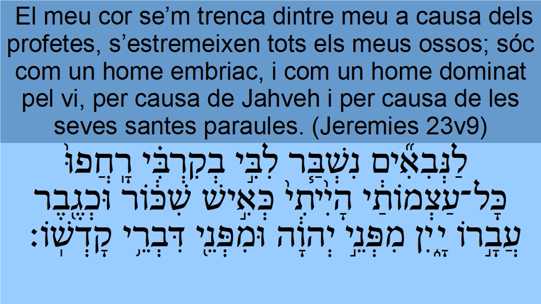 Jeremies 23v9 El meu cor se’m trenca dintre meu a causa dels profetes, s’estremeixen tots els meus ossos; sóc com un home embriac, i com un home dominat pel vi, per causa de Jahveh i per causa de les seves santes paraules.לַנְּבִאִ֞ים נִשְׁבַּ֧ר לִבִּ֣י בְקִרְבִּ֗י רָֽחֲפוּ֙ כָּל־עַצְמוֹתַ֔י הָיִ֙יתִי֙ כְּאִ֣ישׁ שִׁכּ֔וֹר וּכְגֶ֖בֶר עֲבָ֣רוֹ יָ֑יִן מִפְּנֵ֣י יְהוָ֔ה וּמִפְּנֵ֖י דִּבְרֵ֥י קָדְשֽׁוֹ׃ Mine heart <03820> within <07130> me is broken <07665> (08738) because of the prophets <05030>; all my bones <06106> shake <07363> (08804); I am like a drunken <07910> man <0376>, and like a man <01397> whom wine <03196> hath overcome <05674> (08804), because <06440> of the LORD <03068>, and because of the words <01697> of his holiness <06944>.