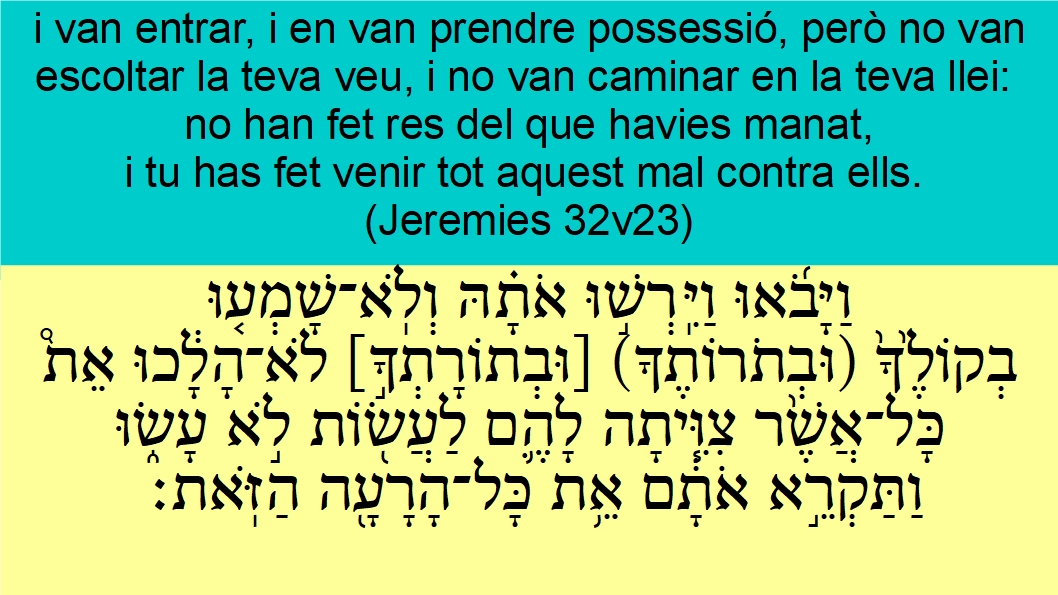 Jeremies 32v23 i van entrar, i en van prendre possessió, però no van escoltar la teva veu, i no van caminar en la teva llei: no han fet res del que havies manat, i tu has fet venir tot aquest mal contra ells.וַיָּבֹ֜אוּ וַיִּֽרְשׁ֣וּ אֹתָ֗הּ וְלֹֽא־שָׁמְע֤וּ בְקוֹלֶ֙ךָ֙ (וּבְתֹרוֹתֶךָ) [וּבְתוֹרָתְךָ֣] לֹא־הָלָ֔כוּ אֵת֩ כָּל־אֲשֶׁ֙ר צִוִּ֧יתָה לָהֶ֛ם לַעֲשׂ֖וֹת לֹ֣א עָשׂ֑וּ וַתַּקְרֵ֣א אֹתָ֔ם אֵ֥ת כָּל־הָרָעָ֖ה הַזֹּֽאת׃ And they came in <0935> (08799), and possessed <03423> (08799) it; but they obeyed <08085> (08804) not thy voice <06963>, neither walked <01980> (08804) in thy law <08451>; they have done <06213> (08804) nothing of all that thou commandedst <06680> (08765) them to do <06213> (08800): therefore thou hast caused all this evil <07451> to come <07122> (08686) upon them: