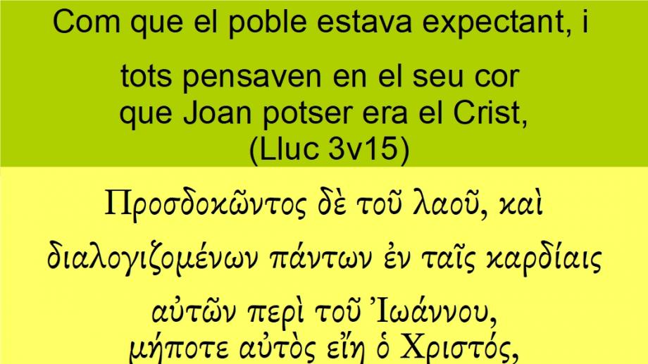 Lluc 3v15 Com que el poble estava expectant, i tots pensaven en el seu cor que Joan potser era el Crist, Προσδοκῶντος δὲ τοῦ λαοῦ, καὶ διαλογιζομένων πάντων ἐν ταῖς καρδίαις αὐτῶν περὶ τοῦ Ἰωάννου, μήποτε αὐτὸς εἴη ὁ Χριστός,