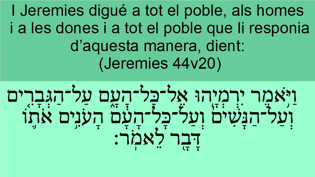 Jeremies 44v20 I Jeremies digué a tot el poble, als homes i a les dones i a tot el poble que li responia d’aquesta manera, dient:וַיֹּ֥אמֶר יִרְמְיָ֖הוּ אֶל־כָּל־הָעָ֑ם עַל־הַגְּבָרִ֤ים וְעַל־הַנָּשִׁים֙ וְעַל־כָּל־הָעָ֔ם הָעֹנִ֥ים אֹת֛וֹ דָּבָ֖ר לֵאמֹֽר׃ Then Jeremiah <03414> said <0559> (08799) unto all the people <05971>, to the men <01397>, and to the women <0802>, and to all the people <05971> which had given him that answer <01697> <06030> (08802), saying <0559> (08800),