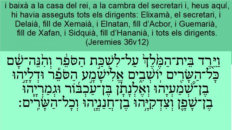 Jeremies 36v12 i baixà a la casa del rei, a la cambra del secretari i, heus aquí, hi havia asseguts tots els dirigents: Elixamà, el secretari, i Delaià, fill de Xemaià, i Elnatan, fill d’Acbor, i Guemarià, fill de Xafan, i Sidquià, fill d’Hananià, i tots els dirigents.וַיֵּ֤רֶד בֵּית־הַמֶּ֙לֶךְ֙ עַל־לִשְׁכַּ֣ת הַסֹּפֵ֔ר וְהִ֙נֵּה־שָׁ֔ם כָּל־הַשָּׂרִ֖ים יֽוֹשְׁבִ֑ים אֱלִישָׁמָ֣ע הַסֹּפֵ֡ר וּדְלָיָ֣הוּ בֶן־שְׁ֠מַעְיָהוּ וְאֶלְנָתָ֙ן בֶּן־עַכְבּ֜וֹר וּגְמַרְיָ֧הוּ בֶן־שָׁפָ֛ן וְצִדְקִיָּ֥הוּ בֶן־חֲנַנְיָ֖הוּ וְכָל־הַשָּׂרִֽים׃ Then he went down <03381> (08799) into the king's <04428> house <01004>, into the scribe's <05608> (08802) chamber <03957>: and, lo, all the princes <08269> sat <03427> (08802) there, even Elishama <0476> the scribe <05608> (08802), and Delaiah <01806> the son <01121> of Shemaiah <08098>, and Elnathan <0494> the son <01121> of Achbor <05907>, and Gemariah <01587> the son <01121> of Shaphan <08227>, and Zedekiah <06667> the son <01121> of Hananiah <02608>, and all the princes <08269>.