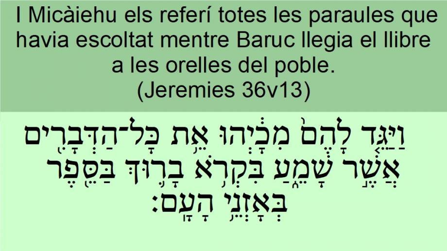 Jeremies 36v13 I Micàiehu els referí totes les paraules que havia escoltat mentre Baruc llegia el llibre a les orelles del poble. וַיַּגֵּ֤ד לָהֶם֙ מִכָ֔יְהוּ אֵ֥ת כָּל־הַדְּבָרִ֖ים אֲשֶׁ֣ר שָׁמֵ֑עַ בִּקְרֹ֥א בָר֛וּךְ בַּסֵּ֖פֶר בְּאָזְנֵ֥י הָעָֽם׃ Then Michaiah <04321> declared <05046> (08686) unto them all the words <01697> that he had heard <08085> (08804), when Baruch <01263> read <07121> (08800) the book <05612> in the ears <0241> of the people <05971>.