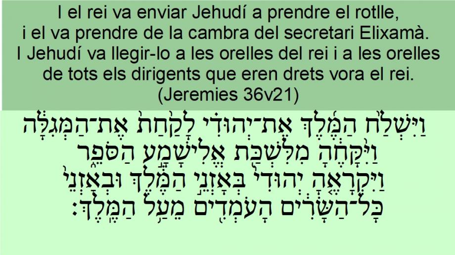 Jeremies 36v21 I el rei va enviar Jehudí a prendre el rotlle, i el va prendre de la cambra del secretari Elixamà. I Jehudí va llegir-lo a les orelles del rei i a les orelles de tots els dirigents que eren drets vora el rei. וַיִּשְׁלַ֙ח הַמֶּ֜לֶךְ אֶת־יְהוּדִ֗י לָקַ֙חַת֙ אֶת־הַמְּגִלָּ֔ה וַיִּ֙קָּחֶ֔הָ מִלִּשְׁכַּ֖ת אֱלִישָׁמָ֣ע הַסֹּפֵ֑ר וַיִּקְרָאֶ֤הָ יְהוּדִי֙ בְּאָזְנֵ֣י הַמֶּ֔לֶךְ וּבְאָזְנֵי֙ כָּל־הַשָּׂרִ֔ים הָעֹמְדִ֖ים מֵעַ֥ל הַמֶּֽלֶךְ׃ So the king <04428> sent <07971> (08799) Jehudi <03065> to fetch <03947> (08800) the roll <04039>: and he took <03947> (08799) it out of Elishama <0476> the scribe's <05608> (08802) chamber <03957>. And Jehudi <03065> read <07121> (08799) it in the ears <0241> of the king <04428>, and in the ears <0241> of all the princes <08269> which stood <05975> (08802) beside <05921> the king <04428>.
