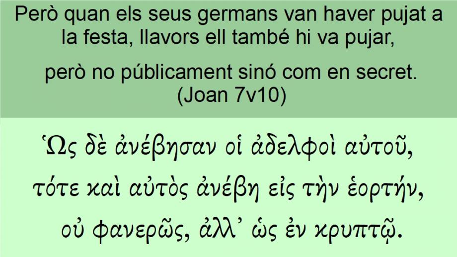 Joan 7v10 Però quan els seus germans van haver pujat a la festa, llavors ell també hi va pujar, però no públicament sinó com en secret.Ὡς δὲ ἀνέβησαν οἱ ἀδελφοὶ αὐτοῦ, τότε καὶ αὐτὸς ἀνέβη εἰς τὴν ἑορτήν, οὐ φανερῶς, ἀλλ᾽ ὡς ἐν κρυπτῷ.But <1161> when <5613> his <846> brethren <80> were gone up <305> (5627), then <5119> went <305> <0> he <846> also <2532> up <305> (5627) unto <1519> the feast <1859>, not <3756> openly <5320>, but <235> as it were <5613> in <1722> secret <2927>.