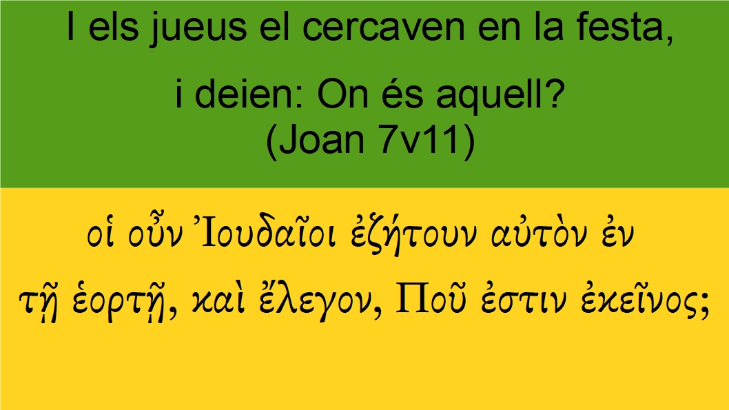 Joan 7v11 I els jueus el cercaven en la festa, i deien: On és aquell?οἱ οὖν Ἰουδαῖοι ἐζήτουν αὐτὸν ἐν τῇ ἑορτῇ, καὶ ἔλεγον, Ποῦ ἐστιν ἐκεῖνος;Then <3767> the Jews <2453> sought <2212> (5707) him <846> at <1722> the feast <1859>, and <2532> said <3004> (5707), Where <4226> is <2076> (5748) he <1565>?