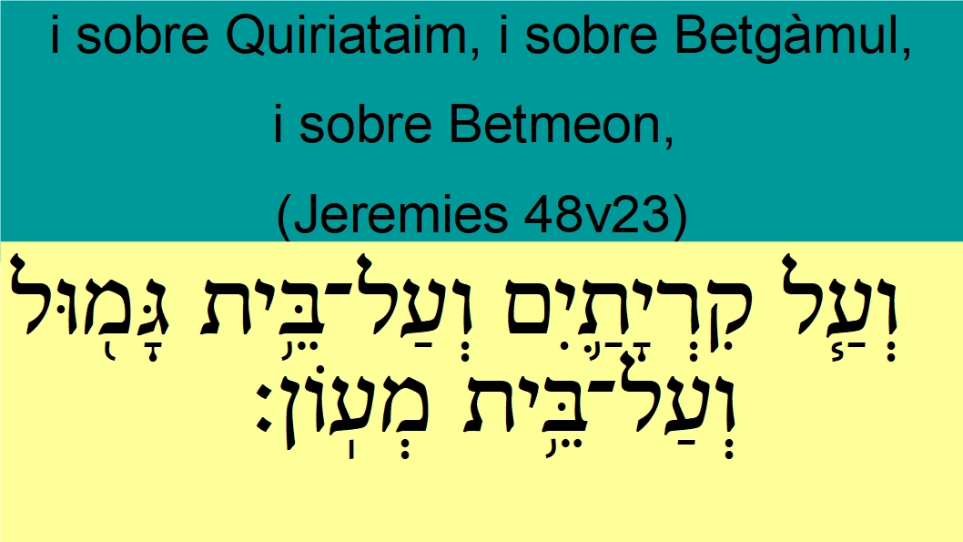 Jeremies 48v23 i sobre Quiriataim, i sobre Betgàmul, i sobre Betmeon,וְעַ֧ל קִרְיָתַ֛יִם וְעַל־בֵּ֥ית גָּמ֖וּל וְעַל־בֵּ֥ית מְעֽוֹן׃ And upon Kiriathaim <07156>, and upon Bethgamul <01014>, and upon Bethmeon <01010>,