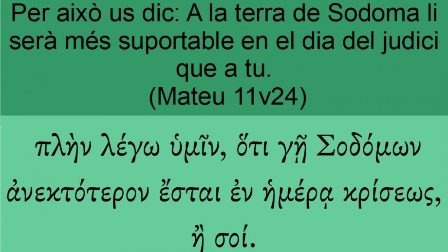 Mateu 11v24 Per això us dic: A la terra de Sodoma li serà més suportable en el dia del judici que a tu. πλὴν λέγω ὑμῖν, ὅτι γῇ Σοδόμων ἀνεκτότερον ἔσται ἐν ἡμέρᾳ κρίσεως, ἢ σοί.