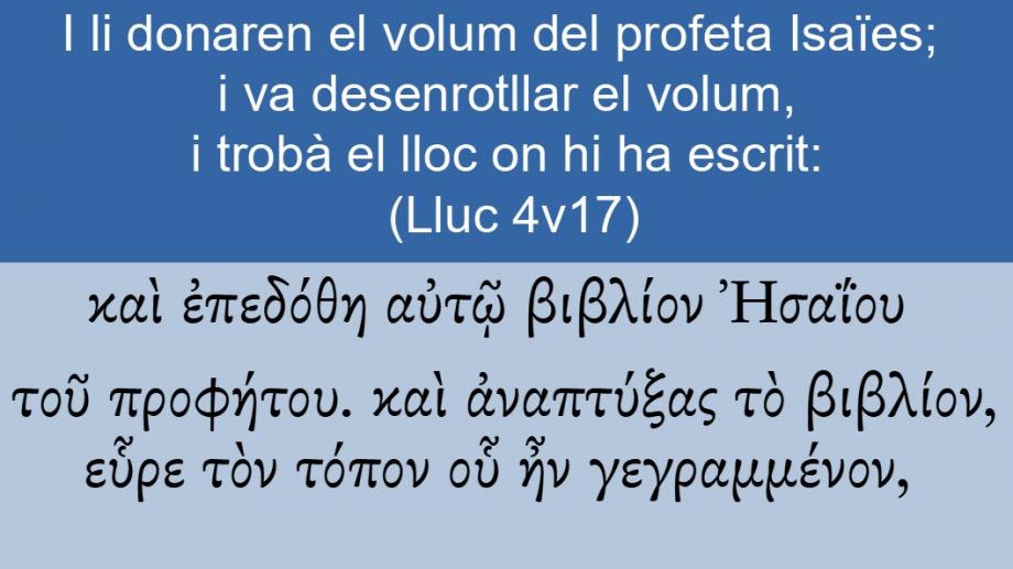Lluc 4v17 I li donaren el volum del profeta Isaïes; i va desenrotllar el volum, i trobà el lloc on hi ha escrit:καὶ ἐπεδόθη αὐτῷ βιβλίον Ἠσαΐου τοῦ προφήτου. καὶ ἀναπτύξας τὸ βιβλίον, εὗρε τὸν τόπον οὗ ἦν γεγραμμένον,And <2532> there was delivered <1929> (5681) unto him <846> the book <975> of the prophet <4396> Esaias <2268>. And <2532> when he had opened <380> (5660) the book <975>, he found <2147> (5627) the place <5117> where <3757> it was <2258> (5713) written <1125> (5772),