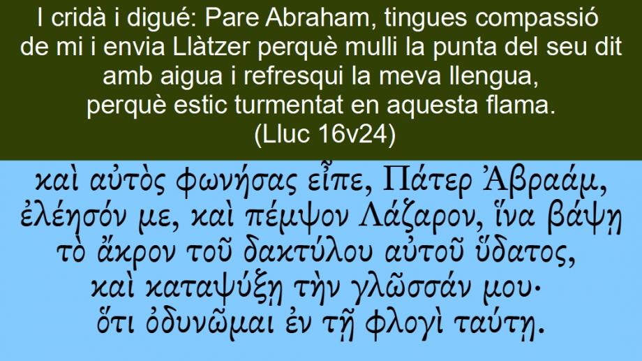 Lluc 16v24 I cridà i digué: Pare Abraham, tingues compassió de mi i envia Llàtzer perquè mulli la punta del seu dit amb aigua i refresqui la meva llengua, perquè estic turmentat en aquesta flama.καὶ αὐτὸς φωνήσας εἶπε, Πάτερ Ἀβραάμ, ἐλέησόν με, καὶ πέμψον Λάζαρον, ἵνα βάψῃ τὸ ἄκρον τοῦ δακτύλου αὐτοῦ ὕδατος, καὶ καταψύξῃ τὴν γλῶσσάν μου· ὅτι ὀδυνῶμαι ἐν τῇ φλογὶ ταύτῃ.En <2532> hij riep <5455> (5660) en zeide <2036> (5627): Vader <3962> Abraham <11>, ontferm u <1653> (5657) mijner <3165>, en <2532> zend <3992> (5657) Lazarus <2976>, dat <2443> hij het uiterste <206> zijns <846> vingers <1147> in het water <5204> dope <911> (5661), en <2532> verkoele <2711> (5661) mijn <3450> tong <1100>; want <3754> ik lijde smarten <3600> (5743) in <1722> deze <5026> vlam <5395>.And <2532> <846> he cried <5455> (5660) and said <2036> (5627), Father <3962> Abraham <11>, have mercy <1653> (5657) on me <3165>, and <2532> send <3992> (5657) Lazarus <2976>, that <2443> he may dip <911> (5661) the tip <206> of his <846> finger <1147> in water <5204>, and <2532> cool <2711> (5661) my <3450> tongue <1100>; for <3754> I am tormented <3600> (5743) in <1722> this <5026> flame <5395>.