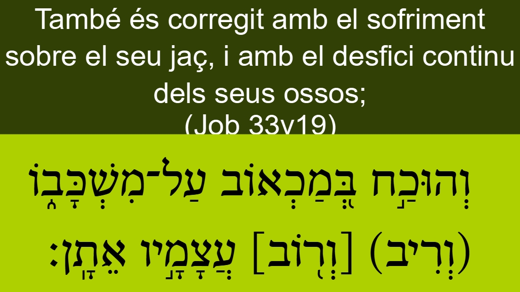 Job 33v19 També és corregit amb el sofriment sobre el seu jaç, i amb el desfici continu dels seus ossos;וְהוּכַ֣ח בְּ֭מַכְאוֹב עַל־מִשְׁכָּב֑וֹ (וְרִיב) [וְר֖וֹב] עֲצָמָ֣יו אֵתָֽן׃ Ook wordt hij gestraft <03198> (08717) met smart <04341> op <05921> zijn leger <04904>, en de sterke <0386> menigte <07230> (08675) <07379> zijner beenderen <06106>;He is chastened <03198> (08717) also with pain <04341> upon his bed <04904>, and the multitude <07230> (08675) <07379> of his bones <06106> with strong <0386> pain:BCI Job 33v19 També el corregeix amb malalties: la febre li crema el cos,1CCC Job 33v19 També és corregit amb el sofriment sobre el seu jaç, i amb el desfici continu dels seus ossos;