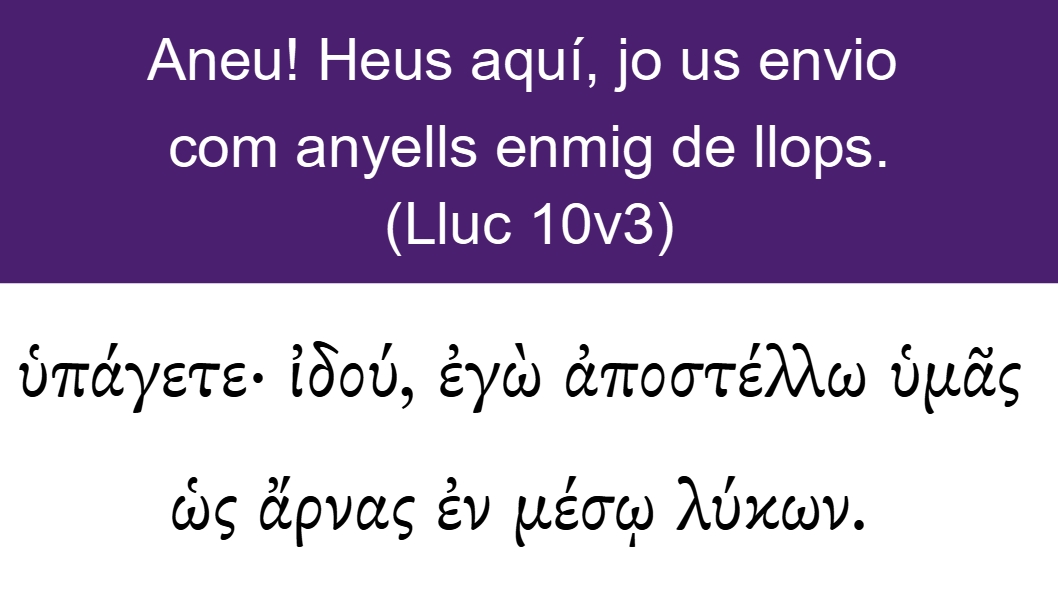 Lluc 10v3 Aneu! Heus aquí, jo us envio com anyells enmig de llops.ὑπάγετε· ἰδού, ἐγὼ ἀποστέλλω ὑμᾶς ὡς ἄρνας ἐν μέσῳ λύκων.Gaat henen <5217> (5720); ziet <2400> (5628), Ik <1473> zend <649> (5719) u <5209> als <5613> lammeren <704> in <1722> het midden <3319> der wolven <3074>.Go your ways <5217> (5720): behold <2400> (5628), I <1473> send <649> <0> you <5209> forth <649> (5719) as <5613> lambs <704> among <1722> <3319> wolves <3074>.BCI Lluc 10v3 Aneu: jo us envio com anyells enmig de llops.1CCC Lluc 10v3 Aneu! Heus aquí, jo us envio com anyells enmig de llops.