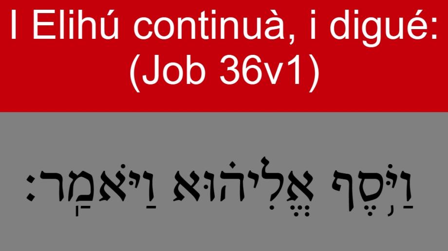 Job 36v1 I Elihú continuà, i digué:וַיֹּ֥סֶף אֱלִיה֗וּא וַיֹּאמַֽר׃ Elihu <0453> ging nog voort <03254> (08686), en zeide <0559> (08799):Elihu <0453> also proceeded <03254> (08686), and said <0559> (08799),BCI Job 36v1 Elihú va continuar encara i va dir:CCC Job 36v1 I Elihú continuà, i digué: