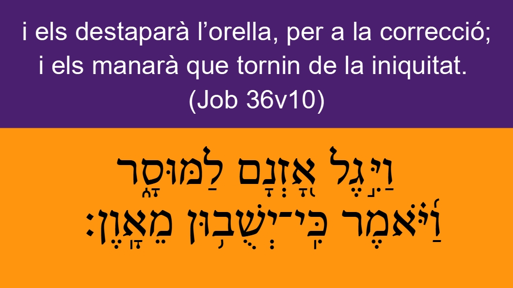 Job 36v10 i els destaparà l’orella, per a la correcció; i els manarà que tornin de la iniquitat. וַיִּ֣גֶל אָ֭זְנָם לַמּוּסָ֑ר וַ֜יֹּ֗אמֶר כִּֽי־יְשֻׁב֥וּן מֵאָֽוֶן׃ En Hij openbaart <01540> (08799) het voor hunlieder oor <0241> ter tucht <04148>, en zegt <0559> (08799), dat <03588> zij zich van <04480> de ongerechtigheid <0205> bekeren zouden <07725> (08799).He openeth <01540> (08799) also their ear <0241> to discipline <04148>, and commandeth <0559> (08799) that they return <07725> (08799) from iniquity <0205>.BCI Job 36v10 els fa parar l'orella a la correcció, els diu que es converteixin de la maldat.CCC Job 36v10 i els destaparà l’orella, per a la correcció; i els manarà que tornin de la iniquitat.