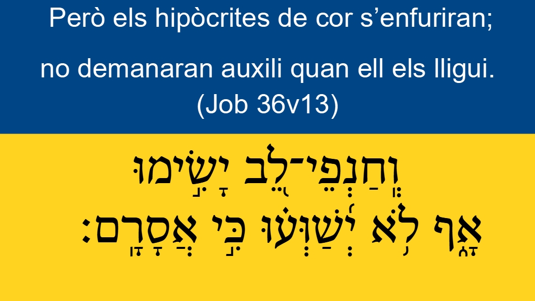 Job 36v13 Però els hipòcrites de cor s’enfuriran; no demanaran auxili quan ell els lligui.וְֽחַנְפֵי־לֵ֭ב יָשִׂ֣ימוּ אָ֑ף לֹ֥א יְ֜שַׁוְּע֗וּ כִּ֣י אֲסָרָֽם׃ En die met het hart <03820> huichelachtig <02611> zijn, leggen <07760> <00> toorn <0639> op <07760> (08799); zij roepen <07768> (08762) niet <03808>, als <03588> Hij hen gebonden heeft <0631> (08804).But the hypocrites of heart increase the wrath: for they call not when he bindeth them.But the hypocrites 1 <02611> in heart <03820> heap up <07760> (08799) wrath <0639>: they 2 cry <07768> (08762) not when he bindeth <0631> (08804) them.BCI Job 36v13 Aquesta gent de mala fe s'encenen, no supliquen quan Déu els afligeix.CCC Job 36v13 Però els hipòcrites de cor s’enfuriran; no demanaran auxili quan ell els lligui.