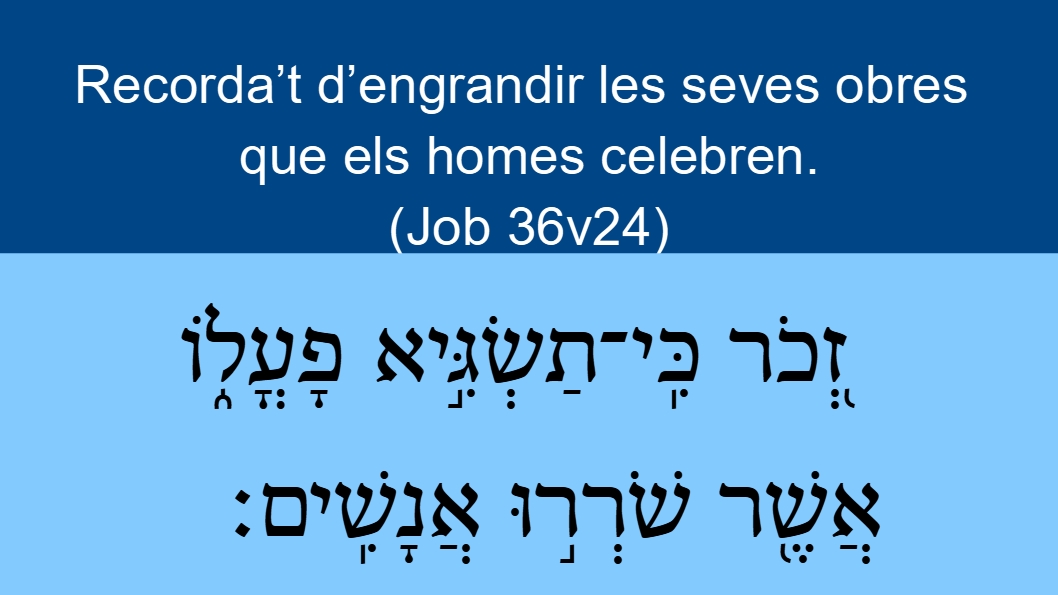 Job 36v24 Recorda’t d’engrandir les seves obres que els homes celebren.זְ֭כֹר כִּֽי־תַשְׂגִּ֣יא פָעֳל֑וֹ אֲשֶׁ֖ר שֹׁרְר֣וּ אֲנָשִֽׁים׃ Gedenk <02142> (08798), dat <03588> gij Zijn werk <06467> groot maakt <07679> (08686), hetwelk <0834> de lieden <0582> aanschouwen <07891> (08790).Remember that thou magnifie his worke, which men behold.Remember <02142> (08798) that thou magnify <07679> (08686) his work <06467>, which men <0582> behold <07891> (08790).BCI Job 36v24 Recorda't de lloar les seves obres, que tots els homes proclamen.CCC Job 36v24 Recorda’t d’engrandir les seves obres que els homes celebren.