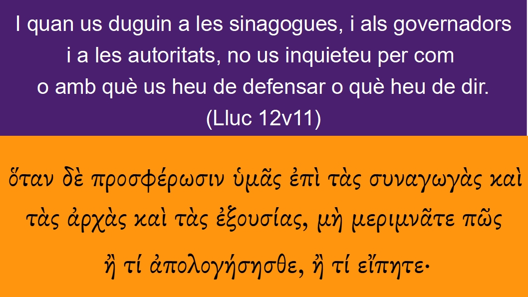 Lluc 12v11 I quan us duguin a les sinagogues, i als governadors i a les autoritats, no us inquieteu per com o amb què us heu de defensar o què heu de dir.ὅταν δὲ προσφέρωσιν ὑμᾶς ἐπὶ τὰς συναγωγὰς καὶ τὰς ἀρχὰς καὶ τὰς ἐξουσίας, μὴ μεριμνᾶτε πῶς ἢ τί ἀπολογήσησθε, ἢ τί εἴπητε·En <1161> wanneer <3752> zij u <5209> heenbrengen zullen <4374> (5725) in <1909> de synagogen <4864>, en <2532> tot de overheden <746> en <2532> de machten <1849>, zo zijt <3309> <0> niet <3361> bezorgd <3309> (5720), hoe <4459> of <2228> wat <5101> gij tot verantwoording zeggen <626> (5667), of <2228> wat <5101> gij spreken zult <2036> (5632);And when they shall bring you vnto the Synagogues, and vnto the rulers and Princes, take no thought howe, or what thing ye shall answere, or what yee shall speake.And <1161> when <3752> they bring <4374> (5725) you <5209> unto <1909> the synagogues <4864>, and <2532> unto magistrates <746>, and <2532> powers <1849>, take <3309> <0> ye no <3361> thought <3309> (5720) how <4459> or <2228> what thing <5101> ye shall answer <626> (5667), or <2228> what <5101> ye shall say <2036> (5632):BCI Lluc 12v11 Quan us condueixin a les sinagogues, als magistrats o a les autoritats, no us preocupeu de com us defensareu ni de què direu:CCC Lluc 12v11 I quan us duguin a les sinagogues, i als governadors i a les autoritats, no us inquieteu per com o amb què us heu de defensar o què heu de dir.