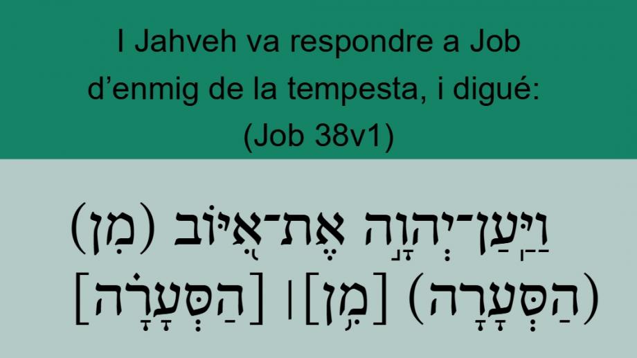 Job 38v1 I Jahveh va respondre a Job d’enmig de la tempesta, i digué: וַיַּֽעַן־יְהוָ֣ה אֶת־אִ֭יּוֹב (מִן) (הַסְּעָרָה) [מִ֥ן]׀ [הַסְּעָרָ֗ה] וַיֹּאמַֽר׃ Daarna antwoordde <06030> (08799) de HEERE <03068> Job <0347> uit <04480> een onweder <05591>, en zeide <0559> (08799):Then answered the Lord vnto Iob out of the whirle winde, and said,Then the LORD <03068> answered <06030> (08799) Job <0347> out of the 1 whirlwind <05591>, and said <0559> (08799),BCI Job 38v1 Llavors el Senyor va interpel·lar Job des del mig de la tempesta i va dir:1CCC Job 38v1 I Jahveh va respondre a Job d’enmig de la tempesta, i digué: