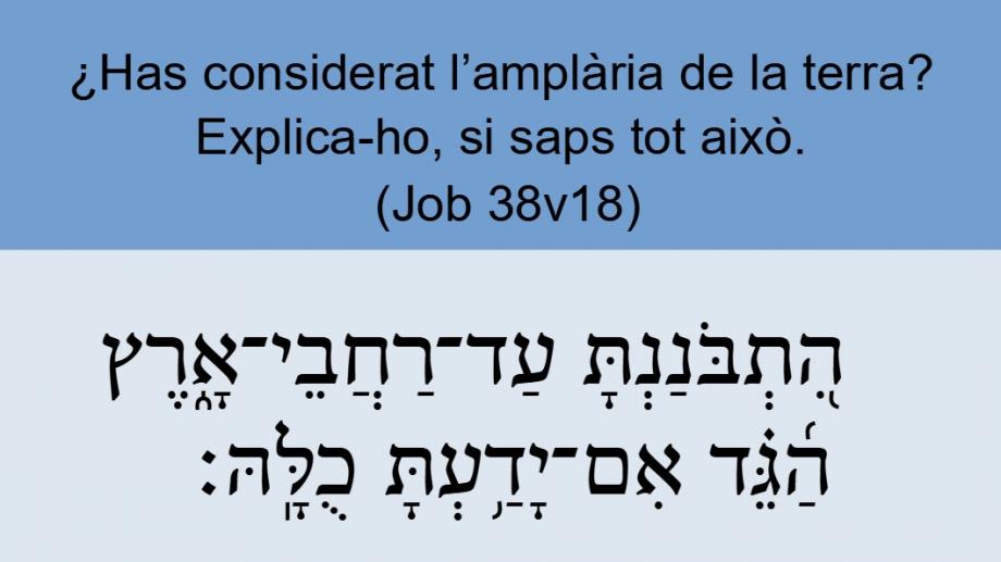 Job 38v18 ¿Has considerat l’amplària de la terra? Explica-ho, si saps tot això.הִ֭תְבֹּנַנְתָּ עַד־רַחֲבֵי־אָ֑רֶץ הַ֜גֵּ֗ד אִם־יָדַ֥עְתָּ כֻלָּֽהּ׃ Zijt gij met uw verstand gekomen <0995> (08712) tot aan <05704> de breedte <07338> der aarde <0776>? Geef het te kennen <05046> (08685), indien <0518> gij dit alles <03605> weet <03045> (08804).Hast thou perceiued the breadth of the earth? tell if thou knowest all this.Hast thou perceived <0995> (08712) the breadth <07338> of the earth <0776>? declare <05046> (08685) if thou knowest <03045> (08804) it all.BCI Job 38v18 ¿Tens idea de l'amplària de la terra? Vés-ho dient, tu que ho saps tot!CCC Job 38v18 ¿Has considerat l’amplària de la terra? Explica-ho, si saps tot això.