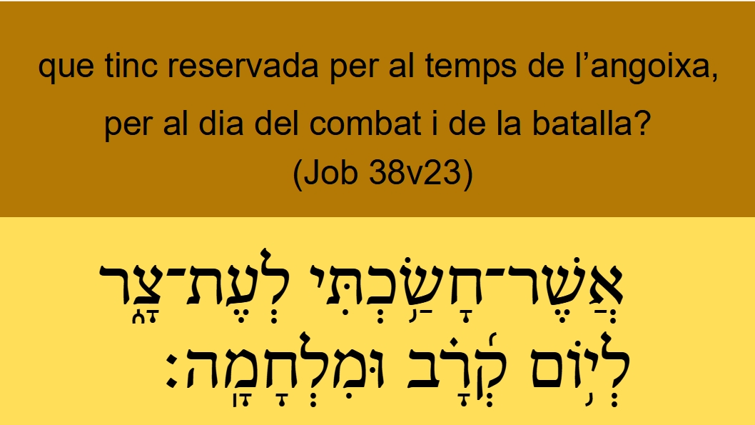 Job 38v23 que tinc reservada per al temps de l’angoixa, per al dia del combat i de la batalla?אֲשֶׁר־חָשַׂ֥כְתִּי לְעֶת־צָ֑ר לְי֥וֹם קְ֜רָ֗ב וּמִלְחָמָֽה׃ Dien <0834> Ik ophoude <02820> (08804) tot den tijd <06256> der benauwdheid <06862>, tot den dag <03117> des strijds <07128> en des oorlogs <04421>!Which I haue hid against the time of trouble, against the day of warre and battell?Which I have reserved 1 <02820> (08804) against the time <06256> of trouble <06862>, against the day <03117> of battle <07128> and war <04421>?que reservo per al temps del desastre, per al dia de lluita i de combat?1CCC Job 38v23 que tinc reservada per al temps de l’angoixa, per al dia del combat i de la batalla?