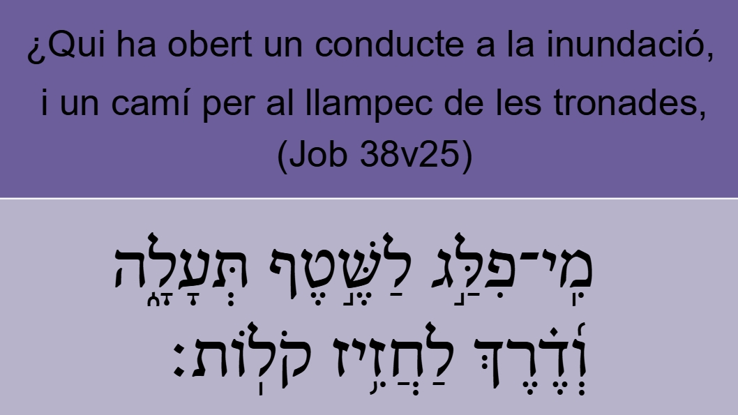 Job 38v25 ¿Qui ha obert un conducte a la inundació, i un camí per al llampec de les tronades, מִֽי־פִלַּ֣ג לַשֶּׁ֣טֶף תְּעָלָ֑ה וְ֜דֶ֗רֶךְ לַחֲזִ֥יז קֹלֽוֹת׃ Wie <0518> deelt <06385> <00> voor den stortregen <08585> een waterloop <07858> uit <06385> (08765), en een weg <01870> voor het weerlicht <02385> der donderen <06963>?Who hath deuided the spowtes for the raine? or the way for the lightning of ye thunders,Who hath divided <06385> (08765) a watercourse <08585> for the overflowing of waters <07858>, or a way <01870> for the lightning <02385> of thunder <06963>;BCI Job 38v25 ¿Qui obre un pas als ruixats i camins a les tempestes,1CCC Job 38v25 ¿Qui ha obert un conducte a la inundació, i un camí per al llampec de les tronades,