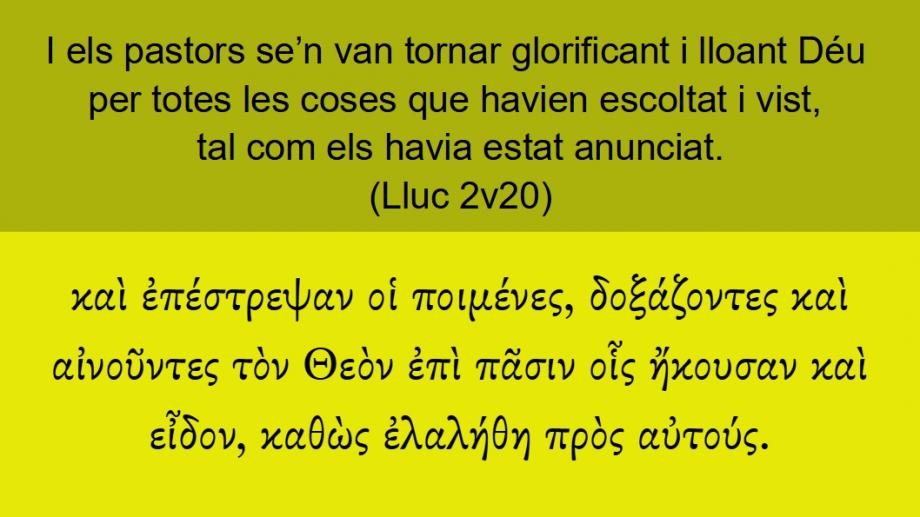 Lluc 2v20 I els pastors se’n van tornar glorificant i lloant Déu per totes les coses que havien escoltat i vist, tal com els havia estat anunciat.καὶ ἐπέστρεψαν οἱ ποιμένες, δοξάζοντες καὶ αἰνοῦντες τὸν Θεὸν ἐπὶ πᾶσιν οἷς ἤκουσαν καὶ εἶδον, καθὼς ἐλαλήθη πρὸς αὐτούς.En <2532> de herders <4166> keerden wederom <1994> (5656), verheerlijkende <1392> (5723) en <2532> prijzende <134> (5723) God <2316> over <1909> alles <3956>, wat <3739> zij gehoord <191> (5656) en <2532> gezien hadden <1492> (5627), gelijk <2531> tot <4314> hen <846> gesproken was <2980> (5681).And the shepheardes returned glorifiyng and praising God, for all that they had heard and seene as it was spoken vnto them.And <2532> the shepherds <4166> returned <1994> (5656), glorifying <1392> (5723) and <2532> praising <134> (5723) God <2316> for <1909> all the things <3956> that <3739> they had heard <191> (5656) and <2532> seen <1492> (5627), as <2531> it was told <2980> (5681) unto <4314> them <846>.BCI Lluc 2v20 Després els pastors se'n tornaren, glorificant Déu i lloant-lo pel que havien vist i sentit: tot ho van trobar tal com els ho havien anunciat.CCC Lluc 2v20 I els pastors se’n van tornar glorificant i lloant Déu per totes les coses que havien escoltat i vist, tal com els havia estat anunciat.