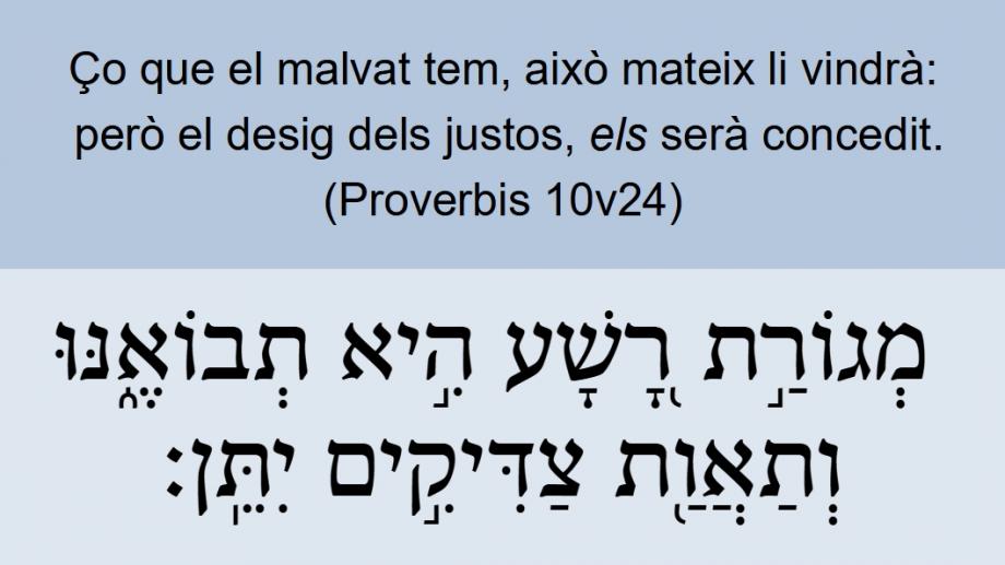 Proverbis 10v24 Ço que el malvat tem, això mateix li vindrà: però el desig dels justos, els serà concedit. מְגוֹרַ֣ת רָ֭שָׁע הִ֣יא תְבוֹאֶ֑נּוּ וְתַאֲוַ֖ת צַדִּיקִ֣ים יִתֵּֽן׃ De vreze <04034> des goddelozen <07563>, die zal hem overkomen <0935> (08799); maar de begeerte <08378> der rechtvaardigen <06662> zal God geven <05414> (08799).GNV Proverbis 10v24 That which the wicked feareth, shall come vpon him: but God wil graunt the desire of the righteous.The fear <04034> of the wicked <07563>, it shall come <0935> (08799) upon him: but the desire <08378> of the righteous <06662> shall be granted <05414> (08799).BCI Proverbis 10v24 El just obté allò que desitja; al malvat li acaba passant el que tem.1CCC Proverbis 10v24 Ço que el malvat tem, això mateix li vindrà: però el desig dels justos, els serà concedit.