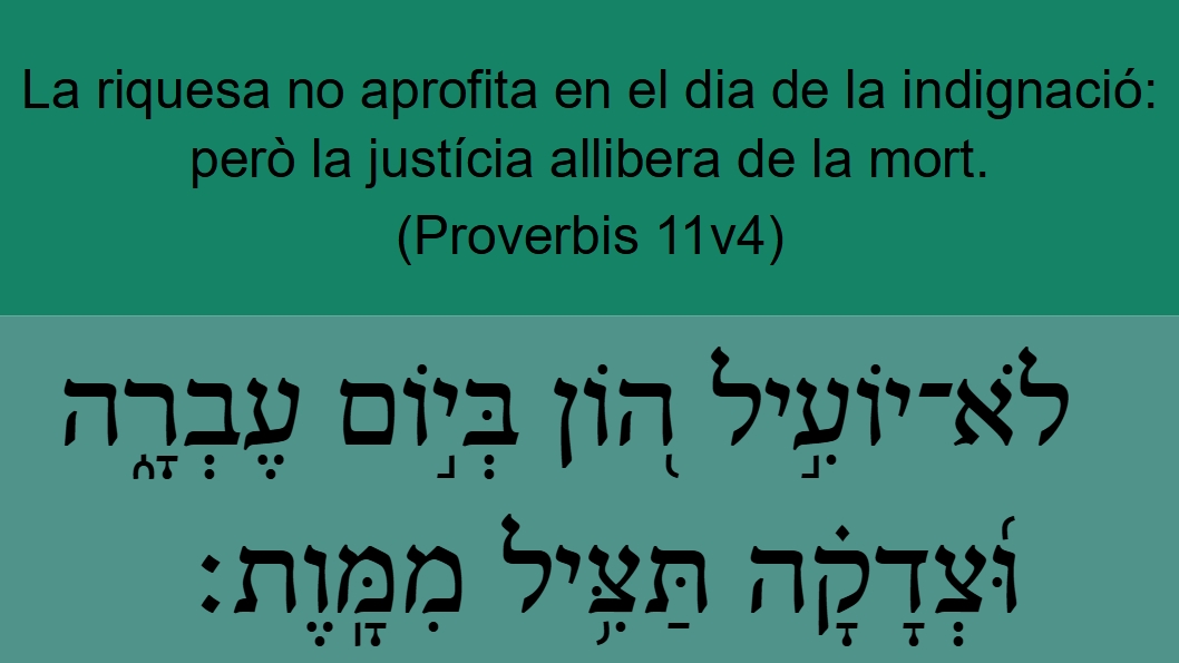 Proverbis 11v4 La riquesa no aprofita en el dia de la indignació: però la justícia allibera de la mort.לֹא־יוֹעִ֣יל ה֭וֹן בְּי֣וֹם עֶבְרָ֑ה וּ֜צְדָקָ֗ה תַּצִּ֥יל מִמָּֽוֶת׃ Goed <01952> doet geen nut <03276> (08686) ten dage <03117> der verbolgenheid <05678>; maar de gerechtigheid <06666> redt <05337> (08686) van den dood <04194>.GNV Proverbis 11v4 Riches auaile not in the day of wrath: but righteousnes deliuereth from death.Riches <01952> profit <03276> (08686) not in the day <03117> of wrath <05678>: but righteousness <06666> delivereth <05337> (08686) from death <04194>.BCI Proverbis 11v4 La riquesa serà inútil el dia del judici;1 només la justícia salvarà de la mort.2CCC Proverbis 11v4 La riquesa no aprofita en el dia de la indignació: però la justícia allibera de la mort.
