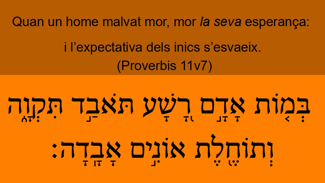 Proverbis 11v7 Quan un home malvat mor, mor la seva esperança: i l’expectativa dels inics s’esvaeix.  בְּמ֤וֹת אָדָ֣ם רָ֭שָׁע תֹּאבַ֣ד תִּקְוָ֑ה וְתוֹחֶ֖לֶת אוֹנִ֣ים אָבָֽדָה׃   Als de goddeloze <07563> mens <0120> sterft <04194>, vergaat <06> (08799) zi