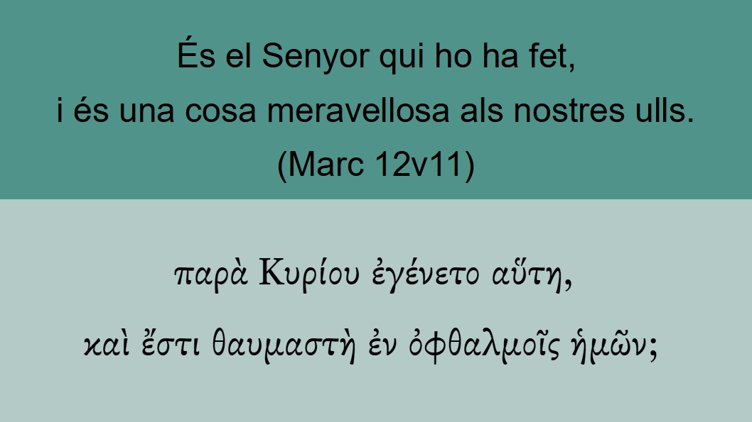 Marc 12v11 És el Senyor qui ho ha fet, i és una cosa meravellosa als nostres ulls.παρὰ Κυρίου ἐγένετο αὕτη, καὶ ἔστι θαυμαστὴ ἐν ὀφθαλμοῖς ἡμῶν;Van <3844> den Heere <2962> is <1096> <0> dit <3778> geschied <1096> (5633), en <2532> het is <2076> (5748) wonderlijk <2298> in <1722> onze <2257> ogen <3788>?GNV Marc 12v11 This was done of the Lord, and it is marueilous in our eyes.This <3778> was <1096> <0> the Lord's <2962> doing <1096> (5633) <3844>, and <2532> it is <2076> (5748) marvellous <2298> in <1722> our <2257> eyes <3788>?BCI Marc 12v11 És el Senyor qui ho ha fet, i els nostres ulls se'n meravellen?»1CCC Marc 12v11 És el Senyor qui ho ha fet, i és una cosa meravellosa als nostres ulls.