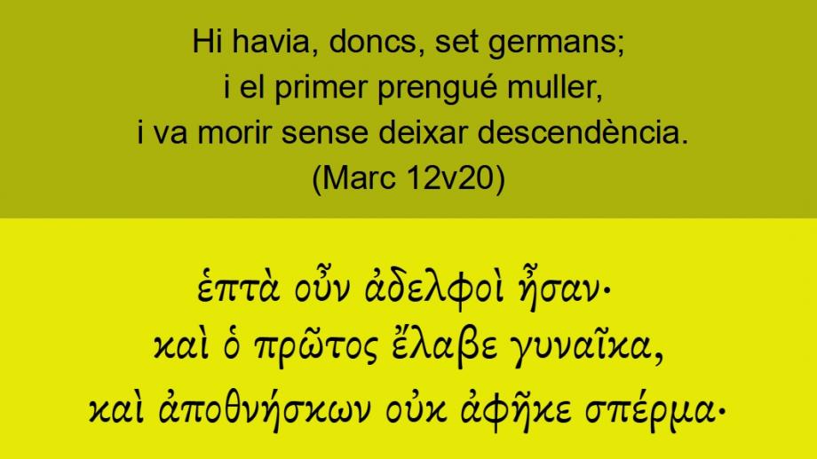 Marc 12v20 Hi havia, doncs, set germans; i el primer prengué muller, i va morir sense deixar descendència.ἑπτὰ οὖν ἀδελφοὶ ἦσαν· καὶ ὁ πρῶτος ἔλαβε γυναῖκα, καὶ ἀποθνήσκων οὐκ ἀφῆκε σπέρμα·Er waren <2258> (5713) nu zeven <2033> broeders <80>, en <2532> de eerste <4413> nam <2983> (5627) een vrouw <1135>, en <2532> stervende <599> (5723) liet <863> <0> geen <3756> zaad <4690> na <863> (5656).There were seuen brethren, and the first tooke a wife, and when he died, left no issue.Now there were <2258> (5713) seven <2033> brethren <80>: and <2532> the first <4413> took <2983> (5627) a wife <1135>, and <2532> dying <599> (5723) left <863> (5656) no <3756> seed <4690>.BCI  Marc 12v20 Doncs bé, hi havia set germans. El primer es va casar, i va morir sense tenir descendència.CCC  Marc 12v20 Hi havia, doncs, set germans; i el primer prengué muller, i va morir sense deixar descendència.